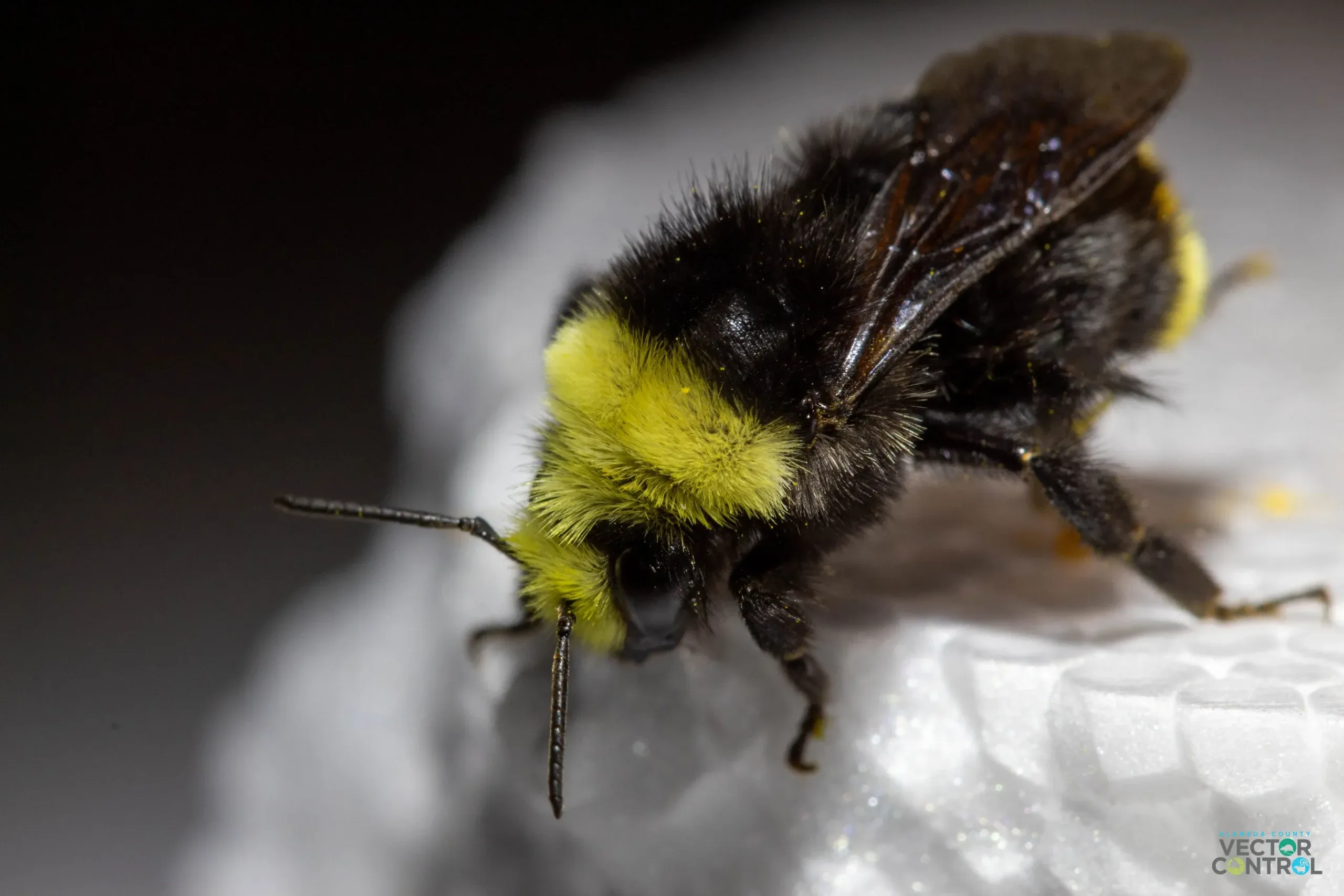 Bumble bees are larger than honeybees, measuring ¾ to one inch long and are usually fuzzy.  Most species form colonies and they typically build their nest in ground cavities, but some are found in wood piles, walls, sheds, or crawl spaces.  The most common species of bumblebee in Alameda County is the yellow-faced bumblebee, Bombus vosnesenskii.  They can become aggressive and sting when their nests are disturbed but are docile while foraging.  Please contact the Vector Control Services District and consult with one of our Biologists before deciding to destroy a bumble bee nest.