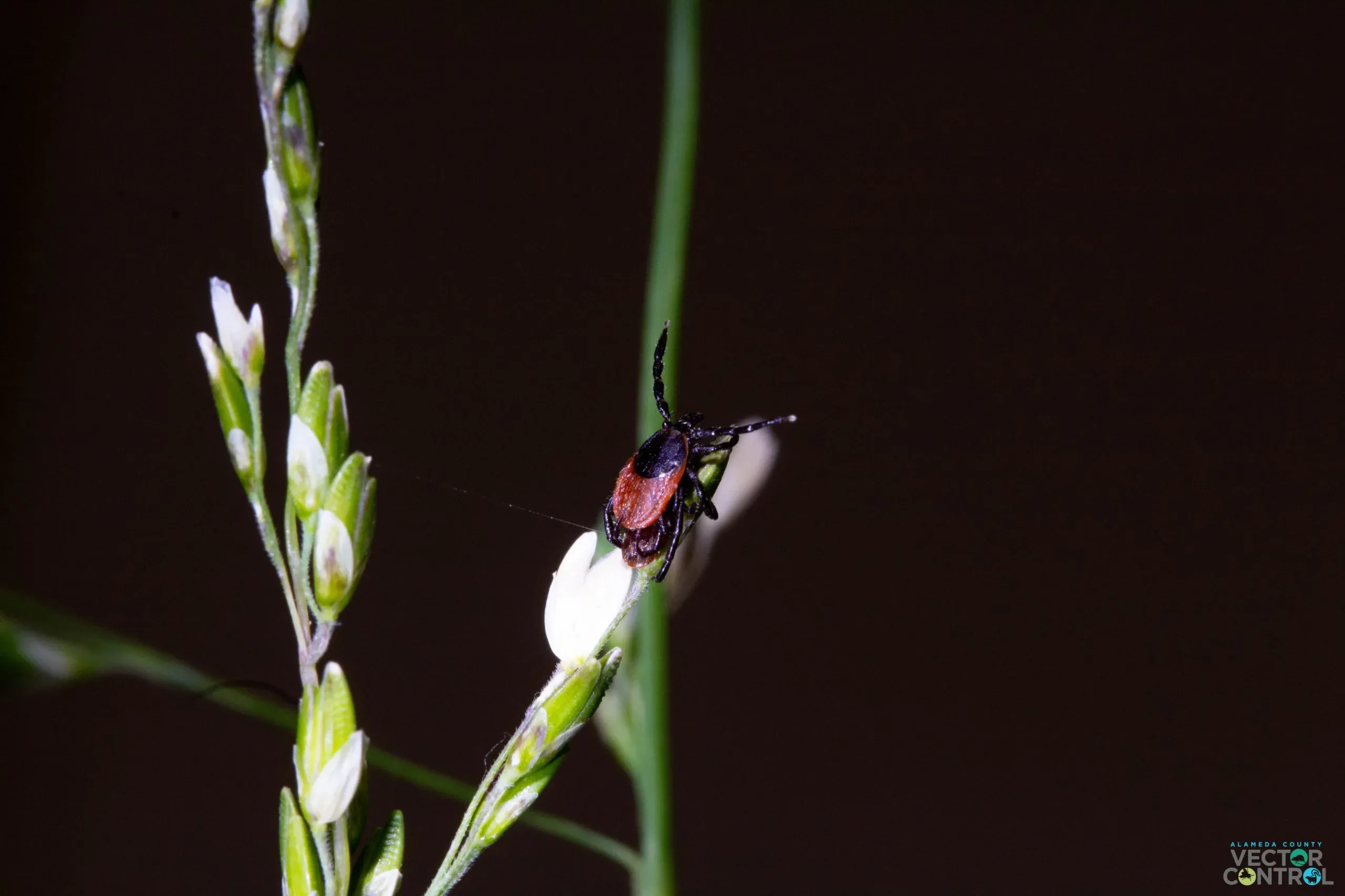 Ticks are small parasitic arachnids that feed off the blood of mammals, birds, reptiles, and amphibians. They undergo four life stages: egg, larva, nymph, and adult, and a blood meal is required to advance to the next developmental stage. There are three common ticks that bite humans in Alameda County: The Western Black Legged tick (Ixodes pacificus), the Pacific Coast tick (Dermacentor occidentalis), and the American Dog tick (Dermacentor similis). Adult ticks look for hosts by perching themselves on overhanging grasses and branches at the edges of trails. Immature ticks are most often found in leaf litter, on wood piles, or mossy rocks.